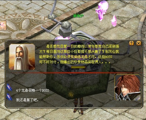 新增BOSS爆出1星药水、水晶卡片、凝练鼎炉等物品。4个凝练鼎炉可以到卡萨城凝练炉里凝练出超级大BOSS!
